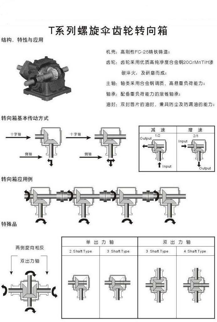 T系列螺旋傘齒輪轉向器采用全系列模塊化式組合設計制造,低噪音、高轉矩、無漏油,單伸出軸、雙伸出軸產品。 結構、特性與反應: 機殼:高剛性FC-25鑄鐵鑄造; 齒輪:齒輪采用優質高純凈度合金鋼20CrMnTiH滲碳淬火,及研磨而成; 主軸:軸類采用合金鋼調質、高懸重負荷能力; 軸承:配備重負荷能力的滾錐軸承; 油封:雙封唇片的油封、兼具防塵及防漏油的能力; 潤滑:適當的潤滑油使用,可以發揮轉向機的效率,并提高其運轉的壽命。 a.初期使用二周或100-200小時,為初摩耗期,這之間可能有少許金屬摩耗粉粒,請務必清潔內部,并換 新潤滑油。 b.長期使用時,每半年-一年或1000-2000小時更換一次潤滑油。