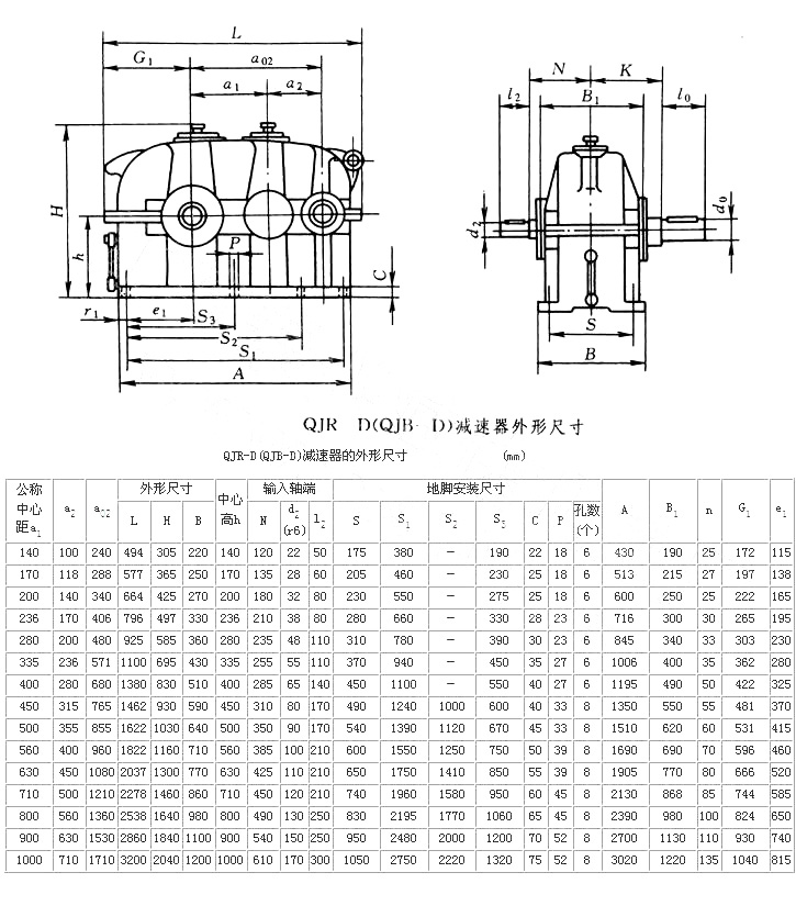 1)結(jié)構(gòu)型式 QJ-D型減速器分為:QJR-D(QJB-D)型為二級,QJS-D(QJC-D)型為三級。QJRS-D(QJD-D)型為二級安裝尺寸三級速比。