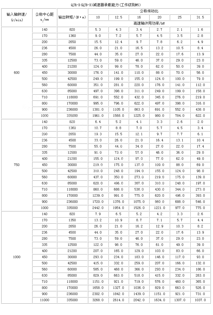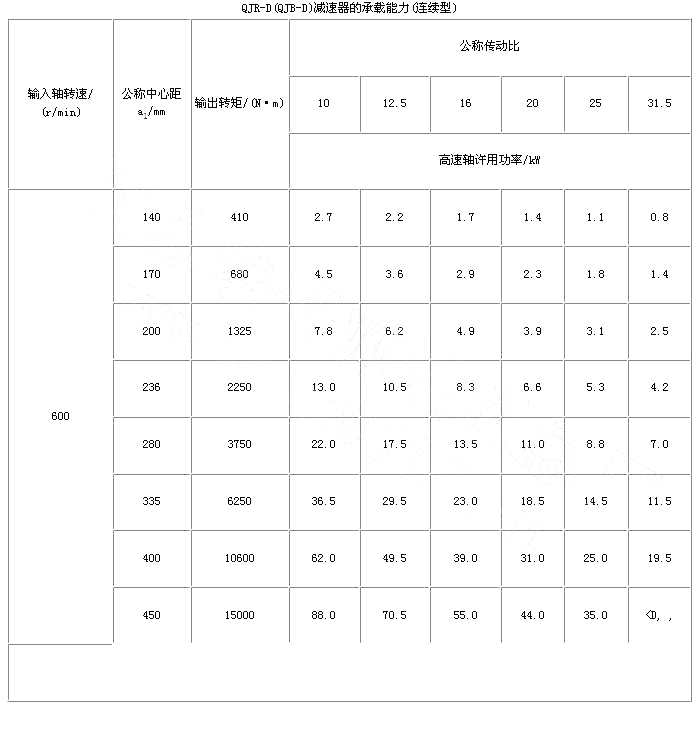 起重機(jī)底座式減速器是在三支點(diǎn)減速器的基礎(chǔ)上派生出來的。因此QJ-D型減速器的工作條件、主要技術(shù)參數(shù)、承載能力和輸出軸端最大允許徑向載荷與三支點(diǎn)減速器相同,其它有所不同。
