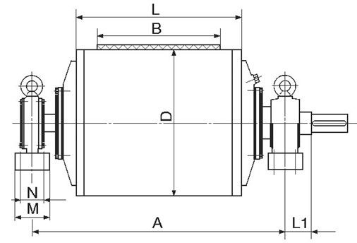 外置式電動滾筒是將電動機裝在滾筒體的外面、減速機構(gòu)裝在滾筒體內(nèi)部的一種新型電動驅(qū)動裝置。它不但具有原電動滾筒的所有優(yōu)點,而且克服了電動機散熱條件差、容易燒損、使用功率受剜限制的弱點,其功率可達160kW甚至更大。