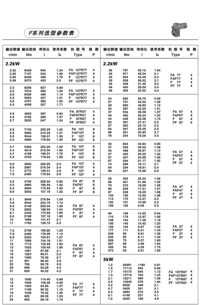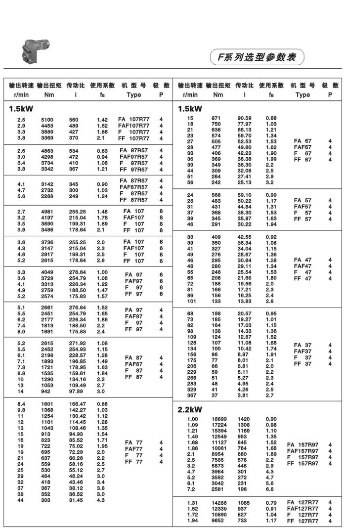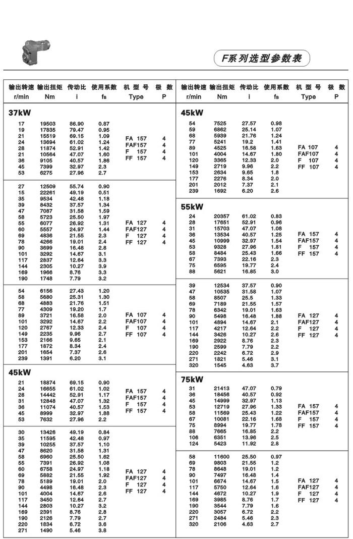 F系列平行軸斜齒輪減速機(jī)性能特點(diǎn): F系列平行軸斜齒輪減速機(jī)具有體積小、重量輕、傳遞扭矩大、起動(dòng)平穩(wěn)、低損耗、安裝方式多樣,輸入輸出靈活等特點(diǎn)。非常適合在空間受限制的情況下使用。并能與各種減、變速機(jī)組合,適用于各種不同條件要求的場(chǎng)所。 技術(shù)參數(shù): 安裝形式: 電機(jī)功率:0.18~200Kw 底腳安裝 輸出轉(zhuǎn)速:0.1~752r/min 法蘭安裝 輸出轉(zhuǎn)矩:高至17000Nm 軸裝安裝